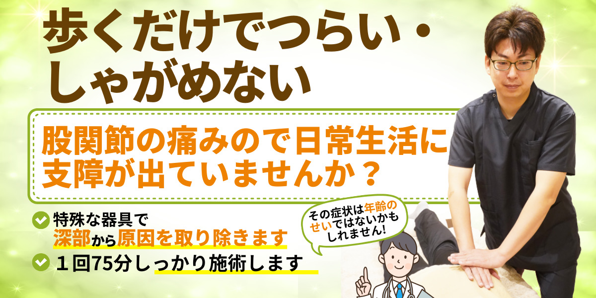 しかし徐々に痛みが増していきリハビリの回数をふやしたが、ある日股関節の激痛で坂の上にある整形外科までたどり着けなくて整体に来ました。