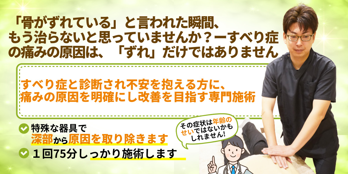 つまりすべり症の痛みは、ずれそのものではなく、ずれた骨を「支えきれなくなった周囲の機能低下」が引き起こしているのです。
