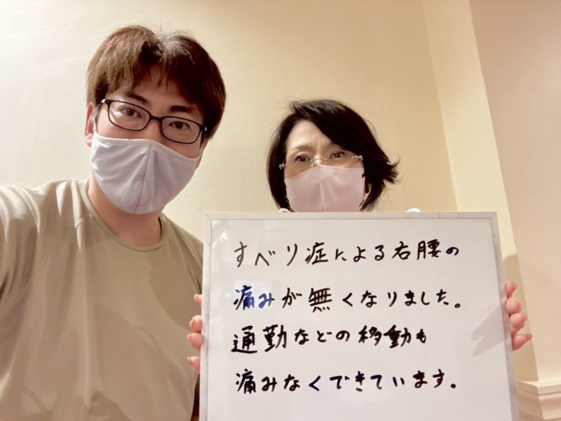 すべり症による右腰から脚痛みの痛みで日常生活や移動の多い仕事のとき困っていました。