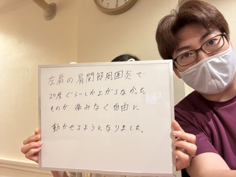 左肩の肩関節周囲炎で20度しか上がらず、夜間痛もあり困っていたところ紹介されて来院されました。